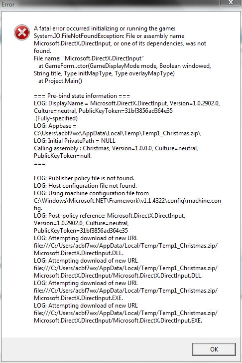 If you got an error message that looks like this, then you need to 'extract' all files to a temporary folder, and then open Christmas.exe